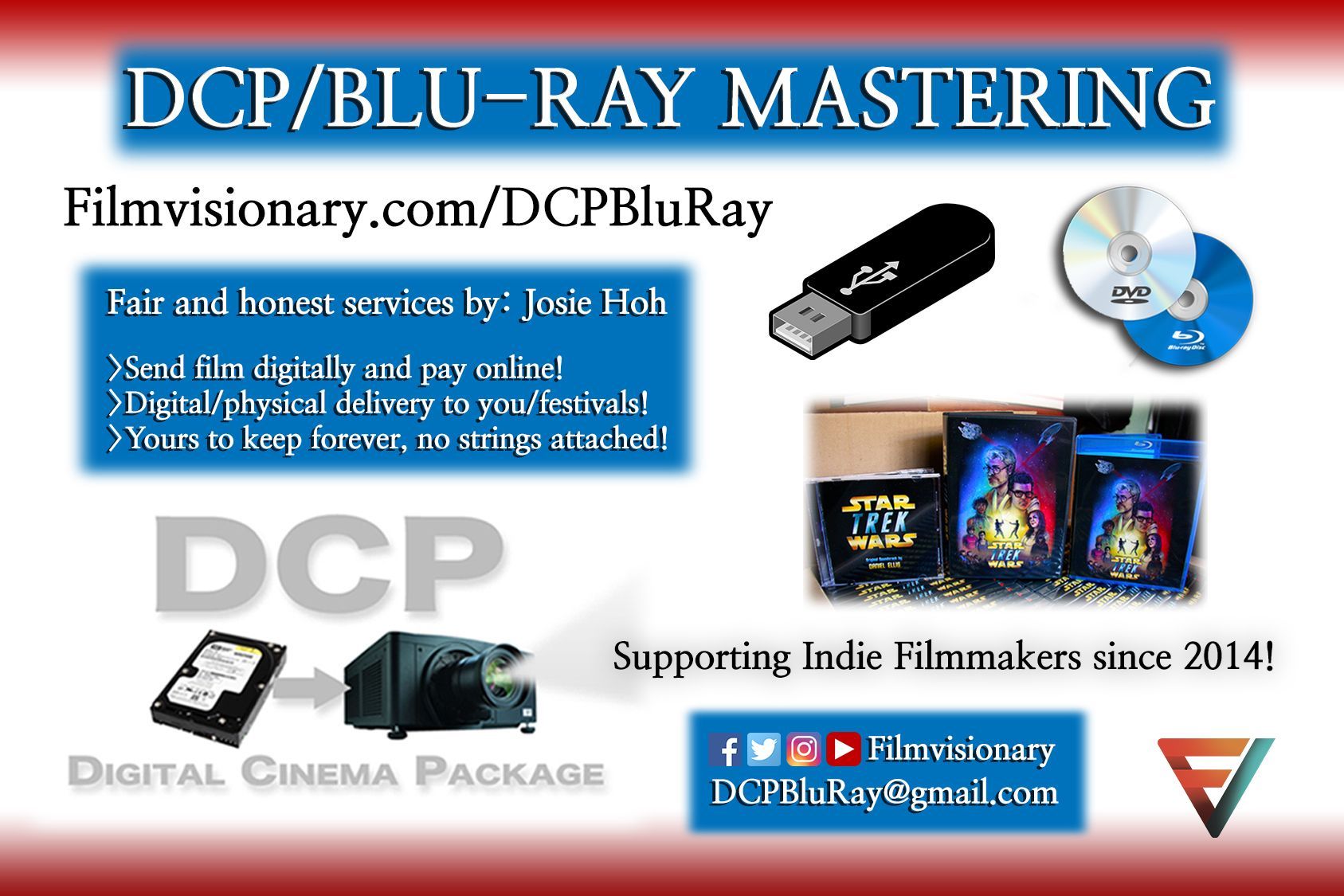 After I graduated from California State University, Long Beach in Narrative Film Production (Directing), I needed to send my own films to festivals. What I discovered was a distribution industry that was completely overpriced for independent filmmakers. So in 2014, I began my Blu-Ray and DCP business to level the playing field so everyone can afford to watch their films up on the big screen!